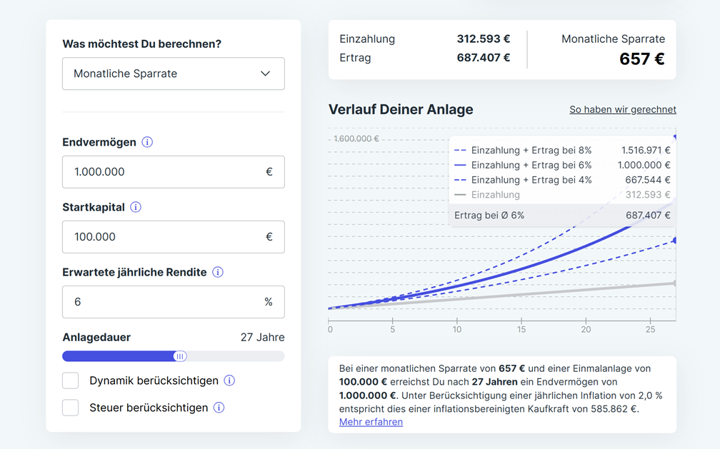 Unter dem Chart siehst Du, wie viel Dein Endvermรถgen in heutiger Kaufkraft wert ist, wenn die jรคhrliche Inflation bei 2 % liegt. Fรผr 1 Mio. โฌ kรถnntest Du Dir 2053 z. B. nur noch so viel kaufen, wie heute fรผr ca. 586.000 โฌ.