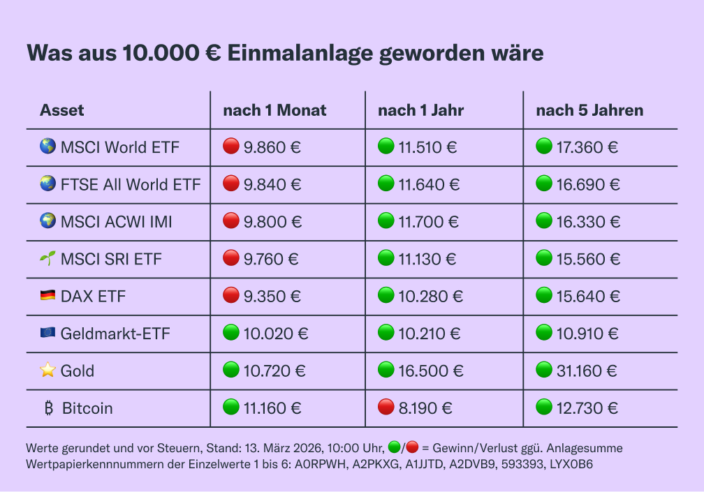 Interessant, wenn Du bisher noch nicht in ETFs investierst โ aber nicht mehr lang zum Ruhestand hast, viel Geld gespart hast und sehr gut verdienst. So findest Du raus, wie viel Geld Du auf einen Schlag investieren musst, damit es trotz kรผrzerer Anlagedauer fรผr Dein Sparziel reicht, wenn Du mit ETFs startest โ z. B. beim Preis-Leistungs-Sieger